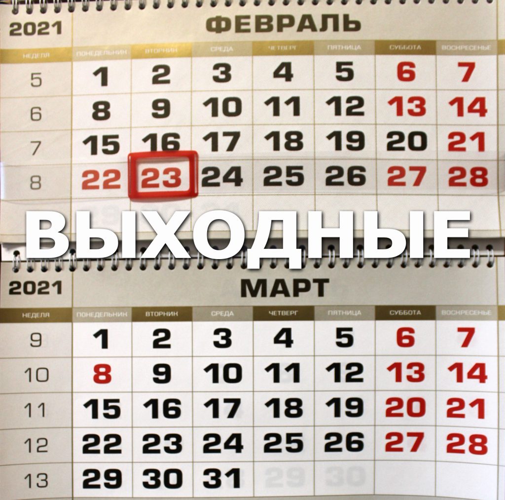 Таким образом, выходными днями в связи с праздничными днями при пятидневной рабочей неделе являются: 21, 22, 23 февраля и 6, 7, 8 марта 2021 года.