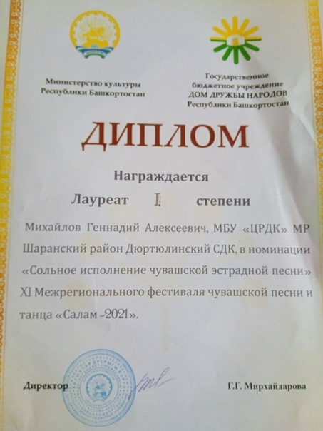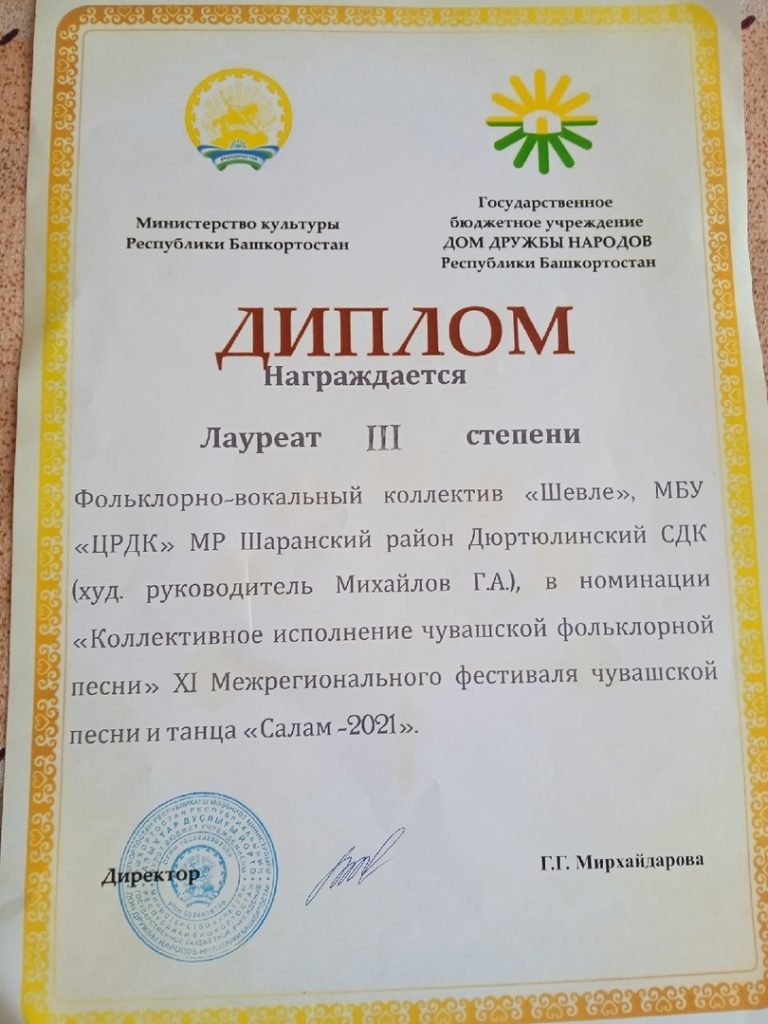 Фестиваль проходил в г. Уфе 28 сентября 2021 года. В номинации «Сольное исполнение чувашской эстрадной песни» выступил руководитель клубного формирования дома культуры Михайлов Геннадий Александрович с песней «Выля хуткупас». Его исполнительское мастерство жюри оценили Дипломом лауреата 1 степени. В номинации «Коллективное исполнение фольклорной песни » фольклорно-вокальный коллектив «Шевле» ( худ. руководитель Михайлов Г.А.) представил на суд жюри два разнохарактерных произведения и стал лауреатом 3 степени!