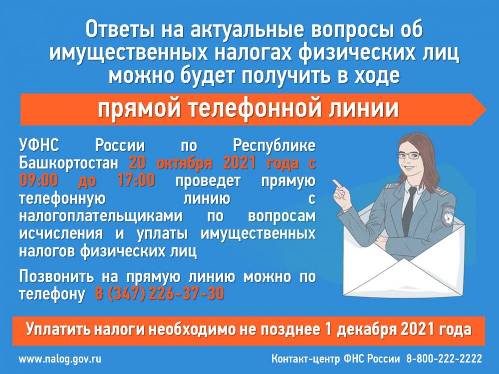 УФНС России по Республике Башкортостан 20 октября 2021 года с 09:00 до 17:00 проведет прямую телефонную линию с налогоплательщиками по вопросам исчисления и уплаты имущественных налогов физических лиц.