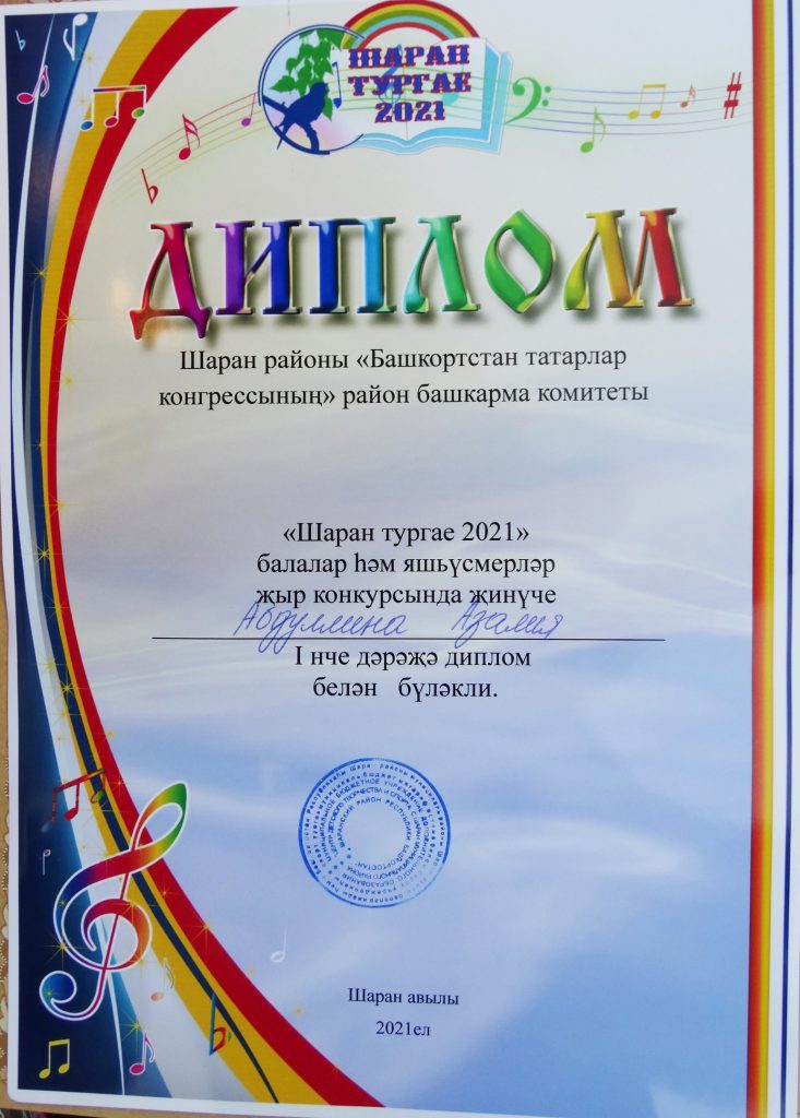 Компетентное жюри в состав которого вошли: Народный артист Республик Башкортостан и Татарстан Фан Валиахметов, композитор, поэт, заслуженный деятель культуры Башкортостана, председатель Всероссийского объединения татарских сел Фанир Галимов, начальник МКУ «Отдел культуры, молодежной политики и спорта» Артём Сидоров и другие. 14 участников и участниц состязались в вокальном творчестве. Наше учреждение культуры представила Азалия Абдуллина, по итогам конкурса она стала обладателем диплома 1 степени.