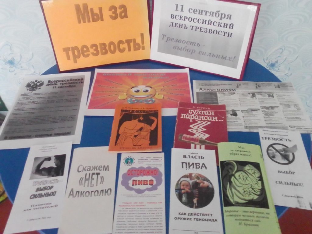 В преддверии Всероссийского Дня трезвости провели информационную акцию «Живи трезво!». В ходе акции проинформировали сельчан о наличии такого замечательного дня, раздавали памятки «Всероссийский день трезвости» и буклеты «Трезвость- выбор сильных».В библиотеке оформлена информационная выставка «Мы за трезвость!».