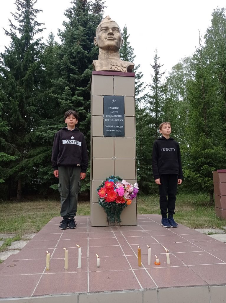 22 июня 1941 года в 4 часа утра началась Великая Отечественная война. Эта страшная дата навсегда останется в памяти всех жителей нашей страны. Накануне памятной даты наша школа присоединилась к всероссийской акции «Свеча памяти». Обучающиеся пришли к памятнику полного кавалера орденов Славы Сабитова Салиха Гиздатовича почтить память солдат, не вернувшихся с полей сражений.
