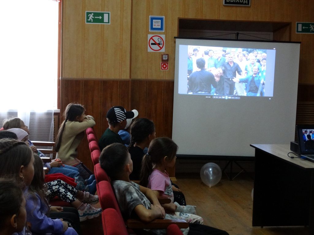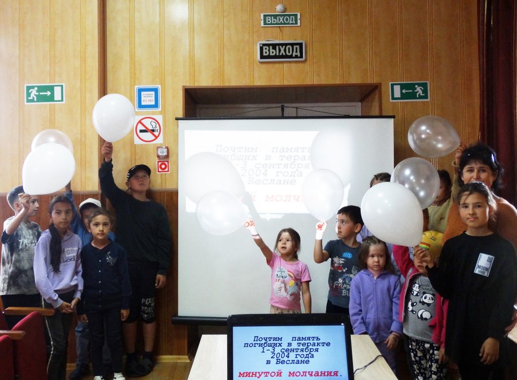 Детям показали презентацию «Мы помним и скорбим» и рассказали о том, что произошло в 2004 году в день, когда должен был начаться учебный год в небольшом городе в Осетии на торжественной линейке. По погибшим в Кавказской республике детям плакал весь мир.
