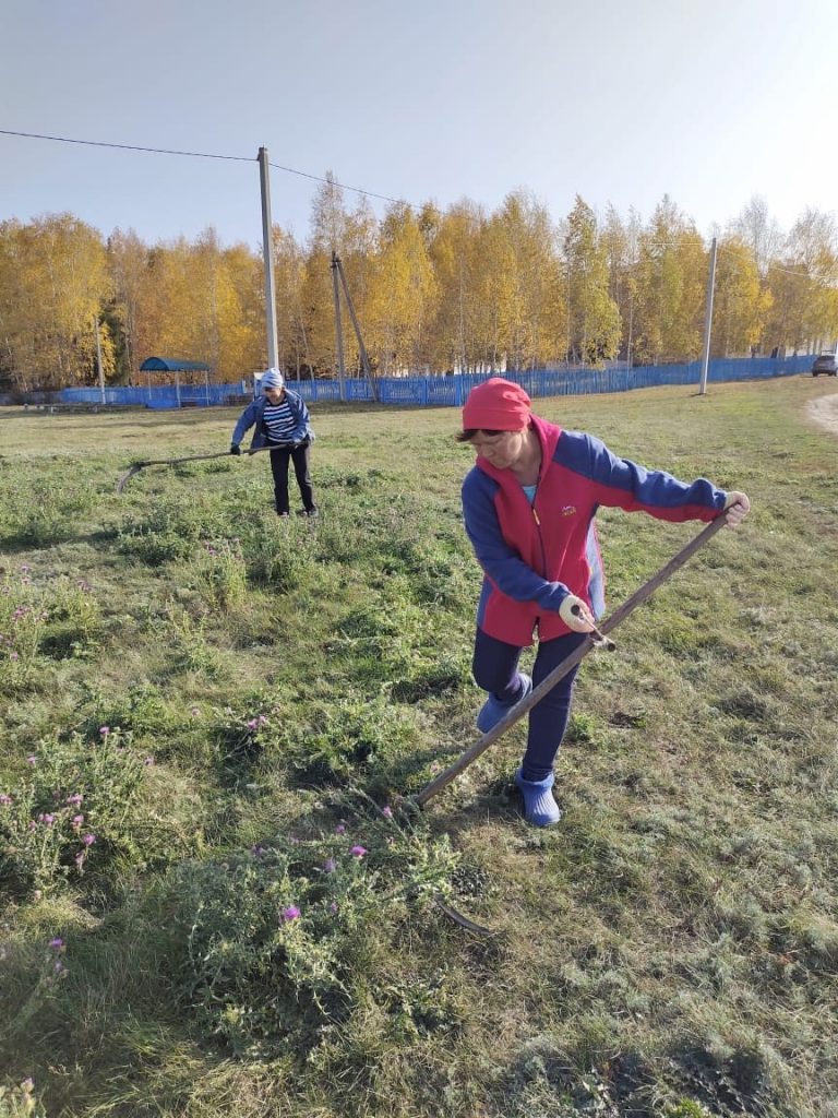 Сегодня выполнен большой обьем работы — собран мусор вдоль дороги, скошена свежая трава на прилегающей территории организаций и учреждений, убран сухостой на приусадебных участках.