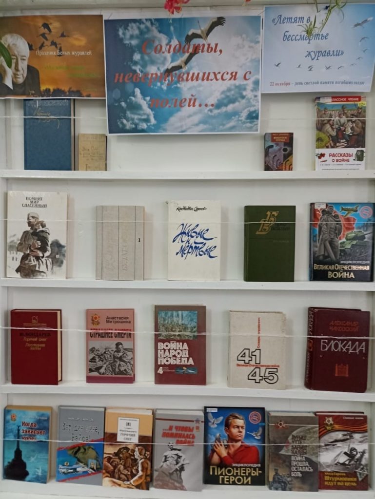 В честь этого дня провели патриотический час «День Белых Журавлей». В ходе мероприятия, ребята узнали об истории возникновения праздника, почему именно журавль является символом, познакомились с произведением Расула Гамзатова «Журавли». Прочитали стихотворения К.Симонова, А.Твардовского, посвященные бессмертному подвигу советского народа в ВОВ. Послушали песню «Журавли». Библиотекарь провела обзор по книжной выставке «Солдаты, невернувшихся с полей…».