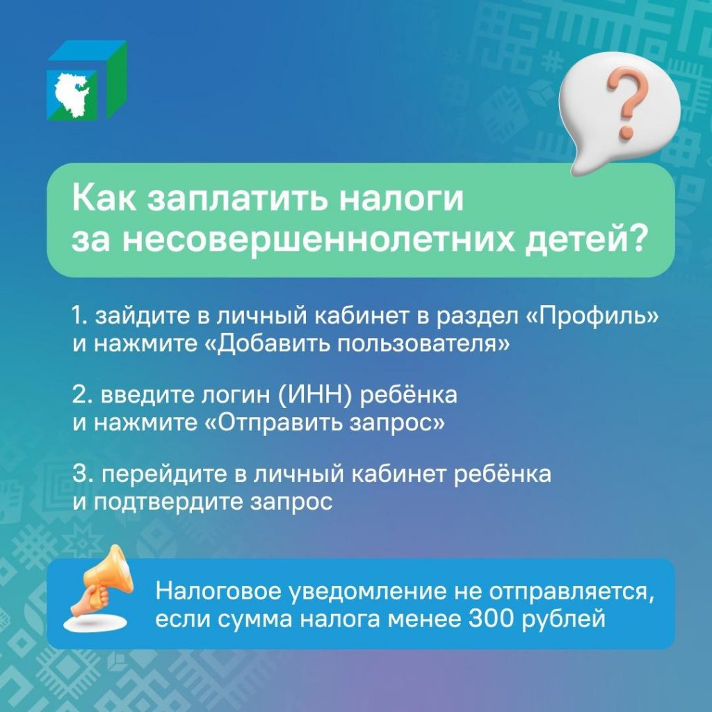 Несовершеннолетние дети могут быть налогоплательщиками, если у них в собственности есть жилье, земельный участок или другие объекты недвижимости. За них налоги платят родители либо усыновители, опекуны или попечители. Сделать это можно на портале «Госуслуги» в личном кабинете. Нужно настроить «Семейный доступ» – зайти в раздел «Профиль», добавить пользователя, ввести его ИНН и подтвердить запрос.