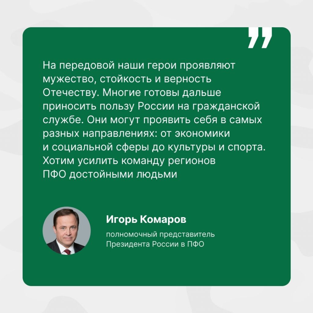 По поручению Владимира Путина в каждом регионе ПФО запустили программу подготовки управленцев из числа участников специальной военной операции – аналог федеральной кадровой программы «Время героев». По словам полномочного представителя Президента России в ПФО Игоря Комарова, на передовой наши герои проявляют мужество, стойкость и верность Отечеству. Многие готовы дальше приносить пользу России на гражданской службе.