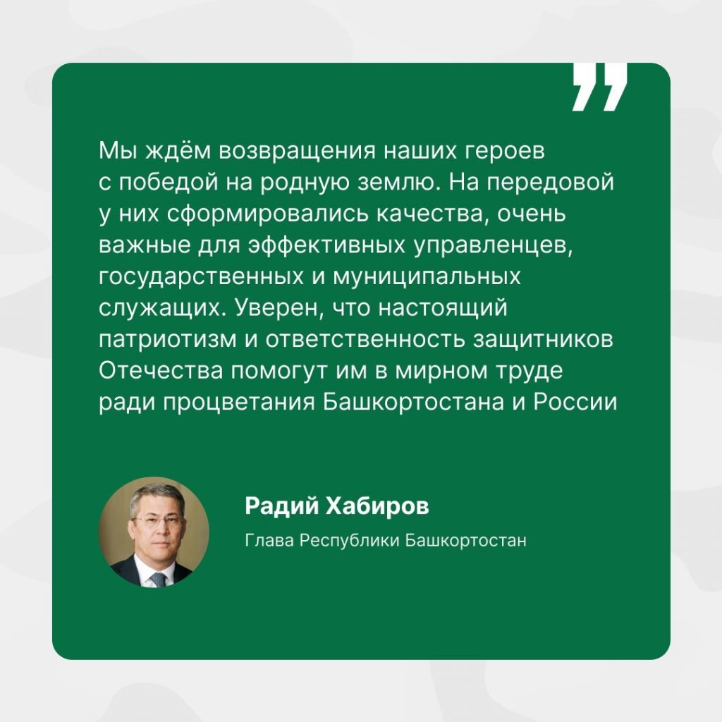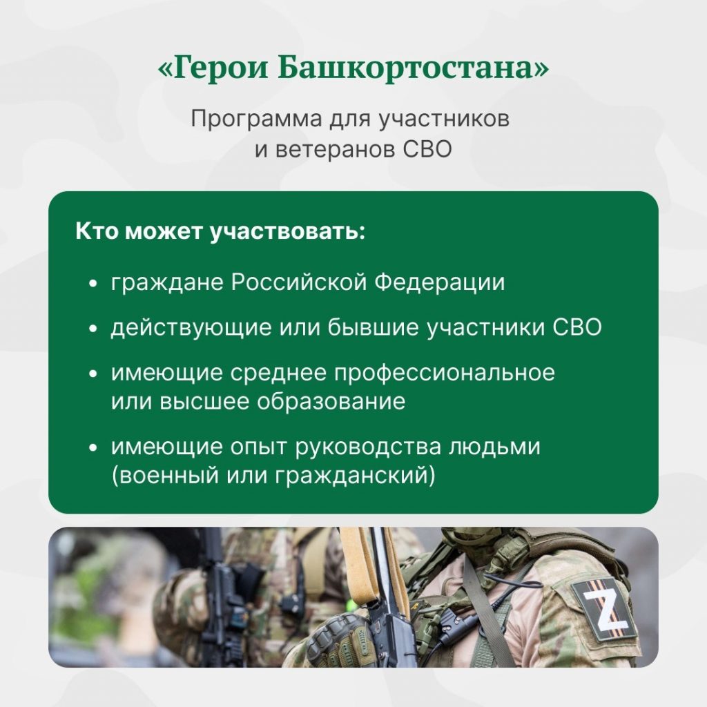 24 февраля 2025 года в республике стартовала региональная программа «Герои Башкортостана». По состоянию на 10 марта для участия в ней подали уже более 900 заявок. Более половины из них – действующие участники СВО. 93 % подавших заявки – жители нашей республики, 7 % – из 36 регионов России. По словам Главы Башкортостана Радия Хабирова, среди участников СВО – много талантливых ребят. На передовой у них сформировались качества, очень важные для эффективных управленцев, государственных и муниципальных служащих.