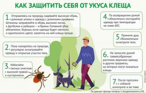 В лесу населению необходимо соблюдать мероприятия по индивидуальной противоклещевой защите: применение репеллентов, которыми обрабатывают открытые участки тела и одежду согласно инструкции, использование (ношение) специальной защитной одежды или одежды светлых тонов, чтобы оперативно обнаружить насекомое. Брюки нужно заправить в сапоги или в носки; на ногах должны быть резиновые сапоги или другая закрытая обувь; на шее лучше, чтобы был высокий ворот или повязана косынка; рубашку или свитер рекомендуется заправить в брюки; вещь должна иметь облегающие манжеты; на голову можно надеть капюшон или шапочку; одежда должна быть удобной и комфортной. Клещи не падают с деревьев, они заползают на траву и небольшие кустарники, и поджидают шанс зацепиться за проходящего человека или животное. Если в лесу избегать высокой травы и ходить только по протоптанным тропам, это снижает риск нападения кровососов. Клещи присасываются не сразу, они сначала ползают по телу, ищут удобное для укуса место, где тонкие кожные покровы и близко расположены кровеносные сосуды (чаще подмышечные и паховые области, шея, за ушами, волосистая часть головы). В отличие от комаров и других кусающих насекомых, укусы клещей практически не ощущаются. Поэтому необходимо периодически осматривать свою одежду и тело самостоятельно или при помощи других людей, а выявленных клещей снимать, также проводить осмотр своих питомцев.