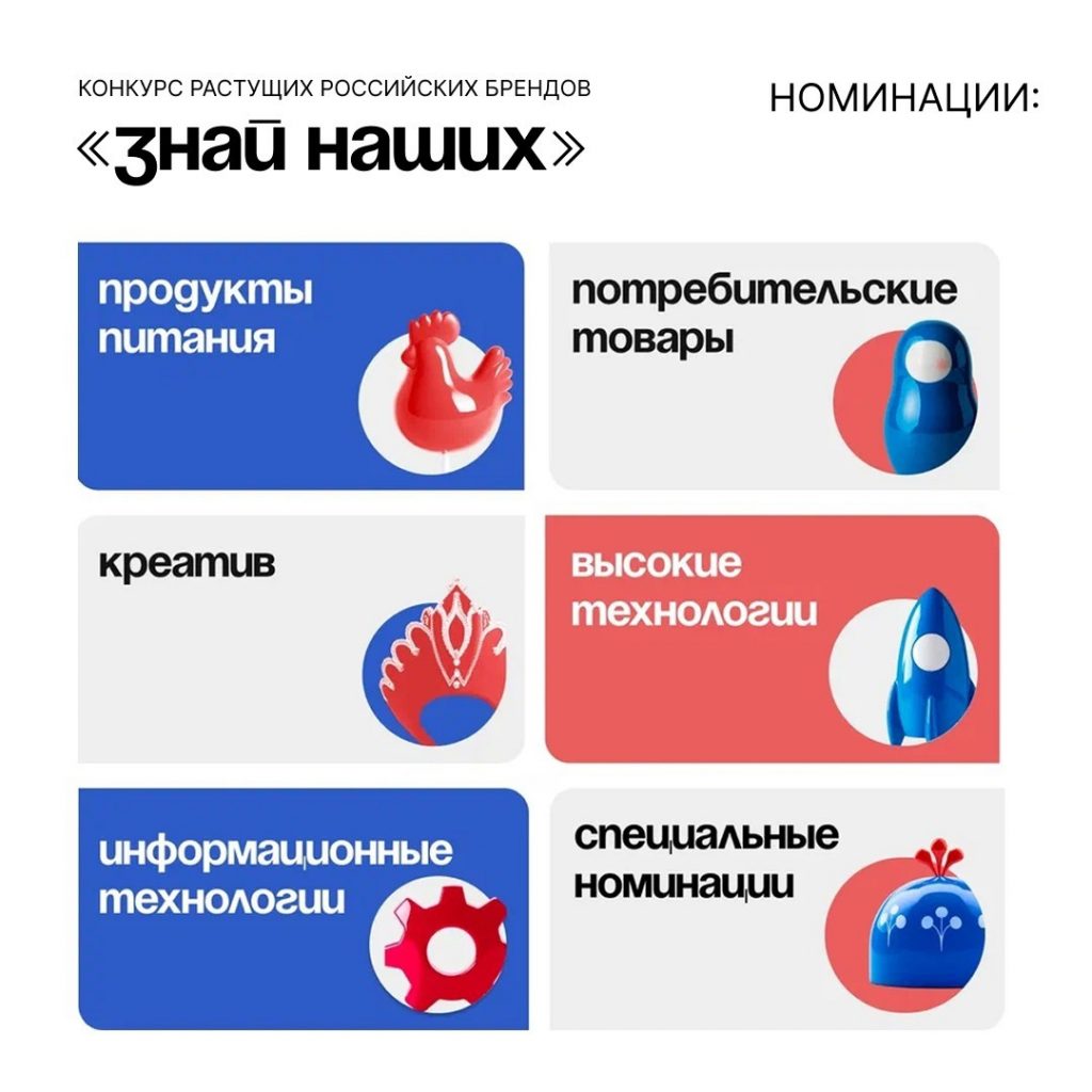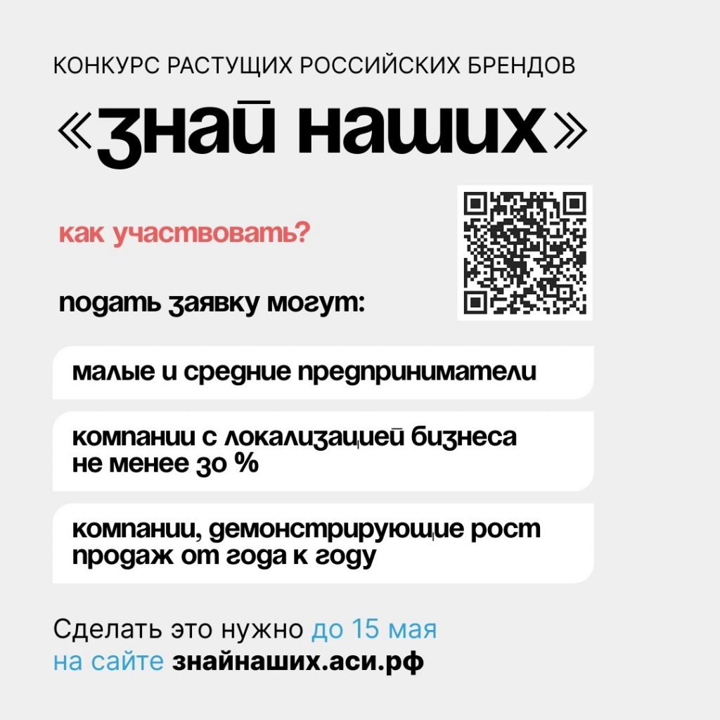 Подать заявку на конкурс отечественных брендов «Знай наших» также нужно до 15 мая. Участвовать в нем могут малые и средние предприниматели, при этом локализация бизнеса должна составлять не менее 30 %, а продажи расти с каждым годом.