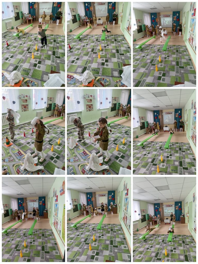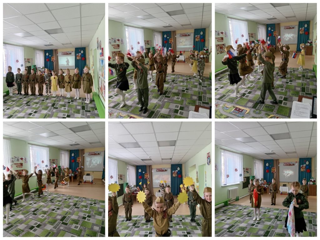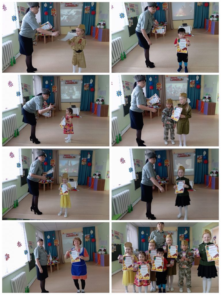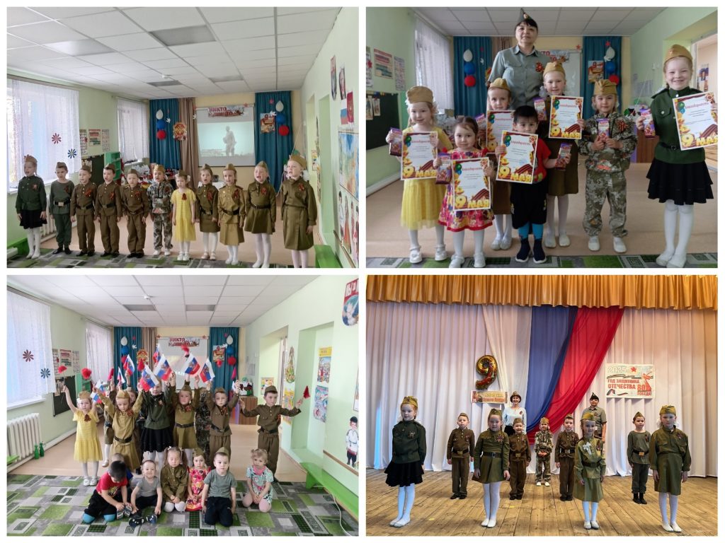 Итоговым мероприятием стало проведение праздничного утренника , посвященного Дню Победы: «Праздник памяти и славы». В программу мероприятия вошли песни и стихи , танцы, игры «Доставь депешу», «Медсестры». Все присутствующие в зале почтили минутой молчания в память о погибших героях войны.