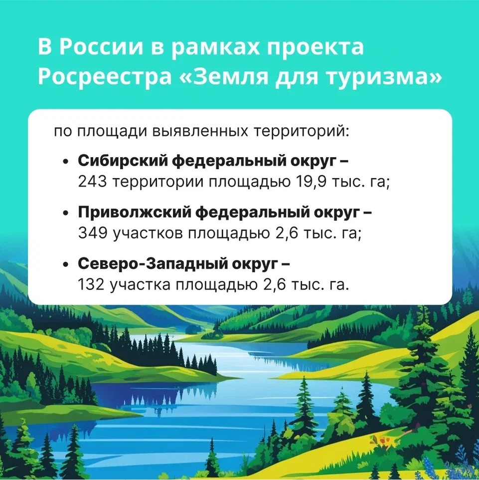 В России в рамках проекта Росреестра «Земля для туризма» с момента его старта в июле 2021 года выявлено 1406 земельных участков и территорий общей площадью 30,3 тыс. га, которые можно использовать для создания туристических объектов.