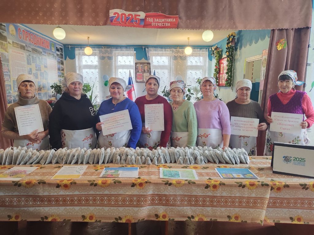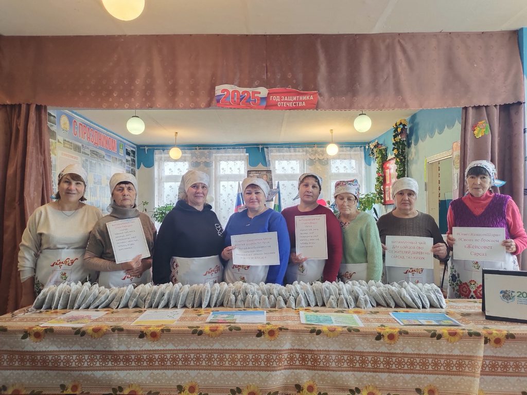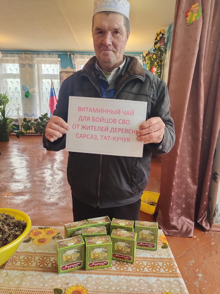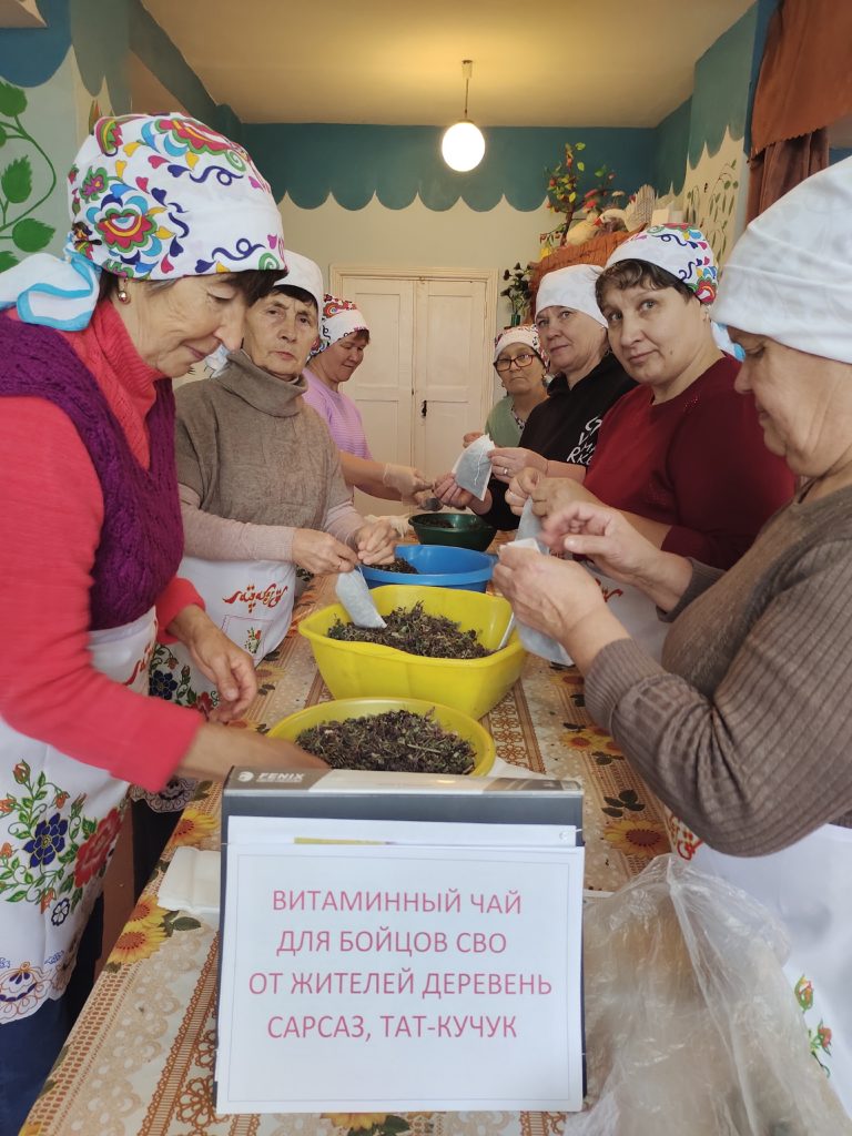 По всей стране проходят акции в поддержку мобилизованных и участников специальной военной операции на Украине. В это непростое для нашей Родины время граждане активно помогают военнослужащим и словом, и делом.Сегодня в Сарсазовском СДК неравнодушные жители деревень Сарсаз и Тат-Кучук приняли активное участие в акции «Витаминный чай для бойцов СВО» по фасовке и упаковке травяного чая для солдат. В состав напитка входят: душица, мята, зверобой, смородиновые листья, цветки липы, множество других целебных растений. В эту смесь добавляют щепотку черного чая, шиповник , боярышник и упаковывают в пакетики. Такие ароматные травяные сборы согревают в холодную погоду, укрепляют иммунитет, насыщают организм витаминами. Всего мы упаковали 100 больших пакетиков витаминного, ароматного чая.