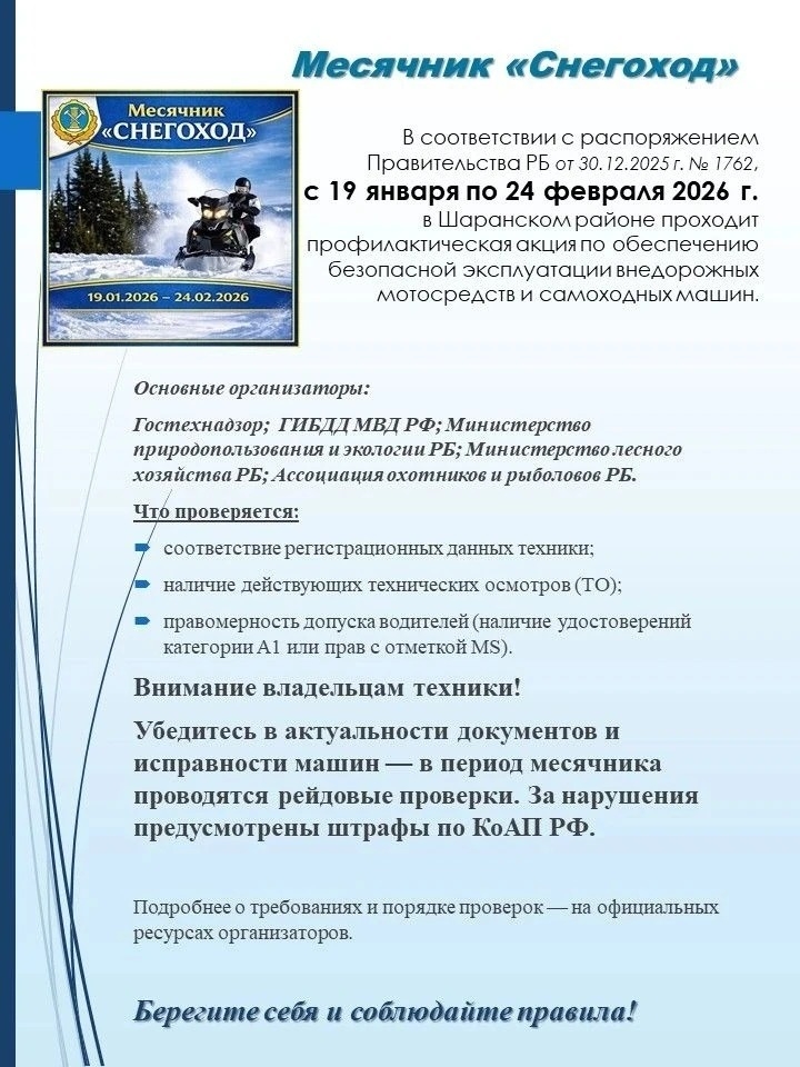 С 19 января по 24 февраля в нашем районе проходит масштабный профилактический месячник «Снегоход». Цель — безопасность на зимних дорогах и в природных зонах. Проверяют документы, техосмотр и права. Рассказываем, на что обратить внимание, чтобы избежать штрафов.